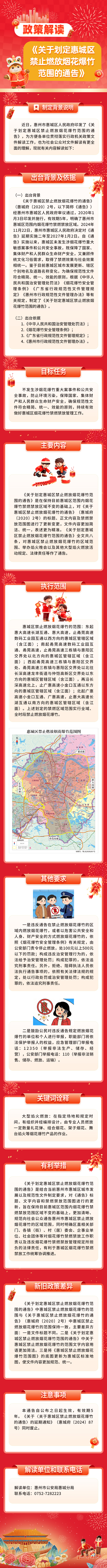 2月9日,惠城区人民政府发布《关于划定惠城区禁止燃放烟花爆竹范围的通告》,进一步加强烟花爆竹燃放管理,明确划定禁止燃放烟花爆竹的范围和相关规定。