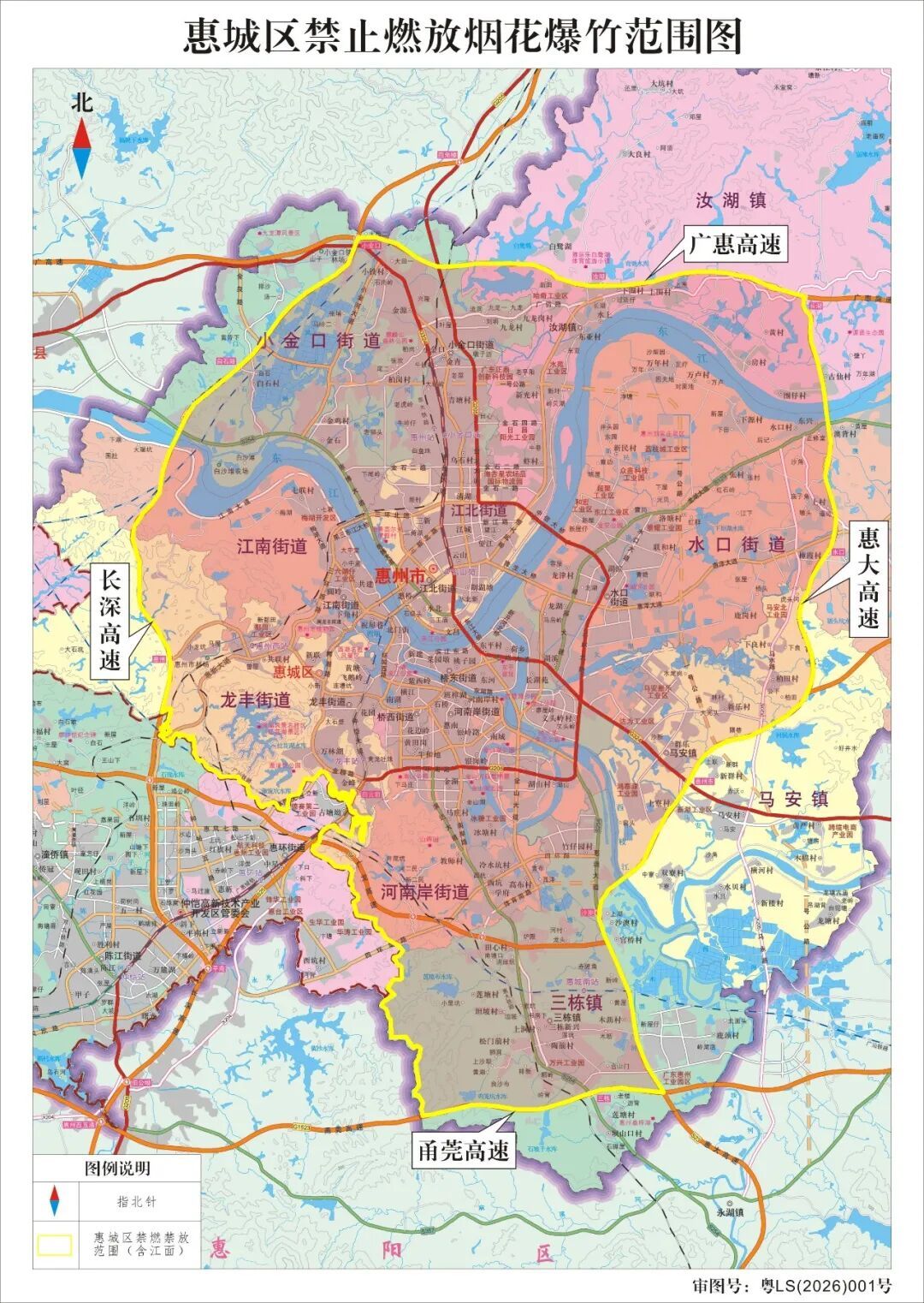 南起甬莞高速数码工业园互通、甬莞高速,止甬莞高速三栋镇与惠阳区交界处以北方向的惠城区管辖区域(含江面);